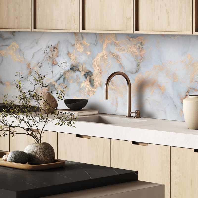 Installée derrière la plaque de cuisson ou l’évier, MARBRE AURUM structure visuellement l’espace et apporte une touche précieuse et contemporaine à la cuisine. Son équilibre entre blanc lumineux et éclats dorés crée une atmosphère élégante et harmonieuse.