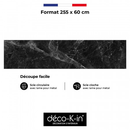 La crédence MARBRE NERO impose son caractère avec un décor marbre noir profond traversé de veinages minéraux contrastés. Sa finition mate révèle toute la richesse du motif et apporte une élégance contemporaine à la cuisine. Résistante et facile d’entretien.