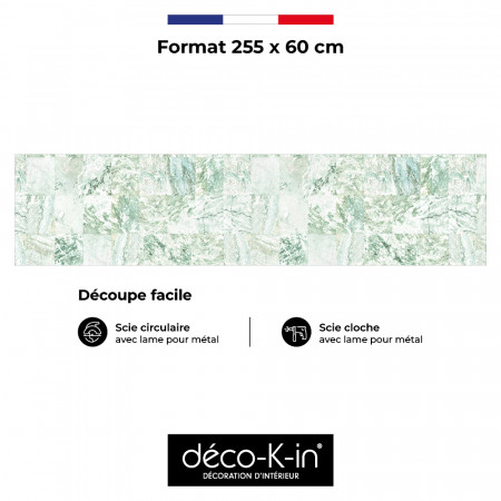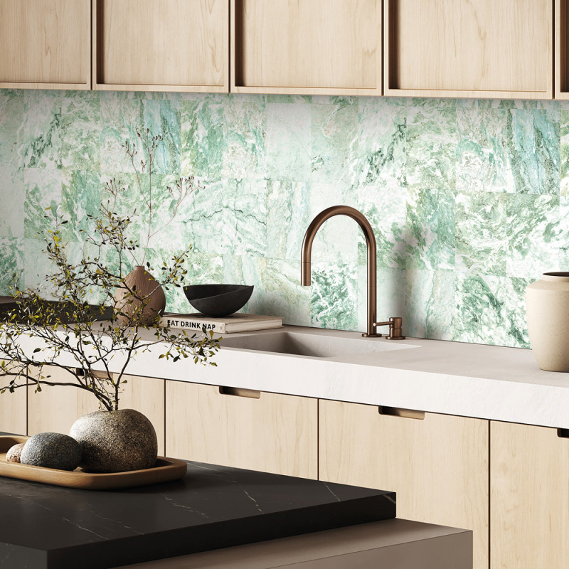 La crédence MARBRE RUSSE révèle toute l’intensité de son marbre vert grâce à une finition mate qui sublime les veinages minéraux. Lumineuse et élégante, elle apporte profondeur et caractère à la cuisine tout en assurant une protection murale résistante et facile d’entretien.