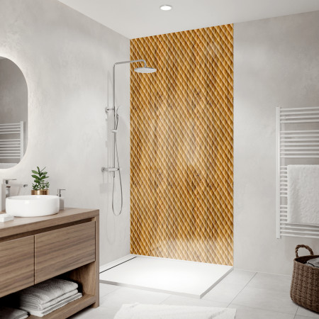 Transformez votre salle de bain avec le panneau mural Bois Losanges. Ses motifs géométriques et son effet bois brillant créent une décoration unique, à la fois moderne et chaleureuse. Résistant à l’humidité, facile à poser et simple à entretenir. Le format d'un losange seul est de L 5,8 x H 9 cm.