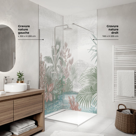 Le modèle Gravure Nature propose une scène végétale inspirée des illustrations anciennes. Son rendu délicat et raffiné, en diptyque gauche/droite, habille la salle de bain d’un décor artistique aux tons doux et naturels, parfait pour une ambiance élégante et apaisante.