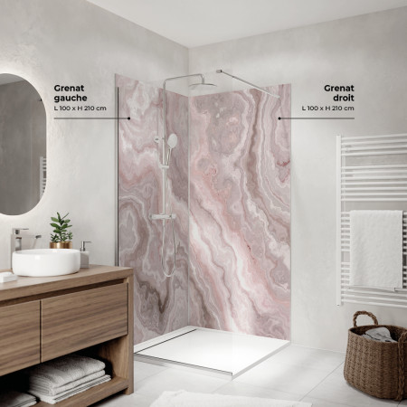 Le modèle Grenat sublime la salle de bain avec son effet pierre semi-précieuse aux nuances rosées et veinures minérales. Disponible en diptyque (version gauche et droite), il permet de créer un décor continu et élégant, idéal pour une ambiance raffinée et contemporaine.