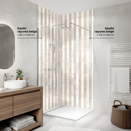 Le visuel mural Kaolin Rayures Beige se pare d’une finition brillante qui magnifie ses tons naturels et ses rayures élégantes. Ce rendu lumineux apporte de la profondeur et un effet raffiné, idéal pour illuminer une salle de bain ou un intérieur contemporain. Le format d'un carreau seul est de L 7,5 x H 30 cm.