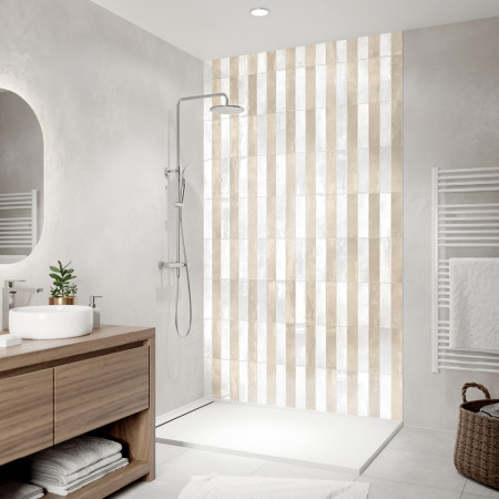 Ses nuances de beige et blanc apportent à la fois douceur et luminosité, tandis que l’aspect lustré sublime les lignes verticales, agrandissant visuellement l’espace. Ce modèle est parfait pour donner du caractère à une salle de bain moderne ou à un intérieur raffiné où l’on recherche à la fois sobriété et éclat.