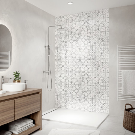 Le décor mural Marocco Blanco est une invitation au voyage et à l’élégance. Inspiré des célèbres zelliges marocains, il met en valeur des formes géométriques florales et entrelacées qui rappellent l’art décoratif traditionnel. Sur un fond marbré aux nuances subtiles de gris et de blanc, les motifs s’imposent avec une modernité assumée.