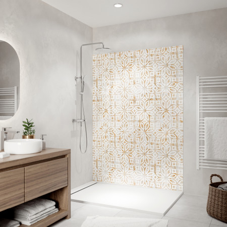 Le décor mural Marocco Oro s’inspire de l’art décoratif marocain et revisite le traditionnel zellige dans une version contemporaine et luxueuse. Ses motifs géométriques entrelacés, aux allures florales et orientales, se parent ici de subtiles nuances dorées qui rappellent l’élégance des marbres précieux.