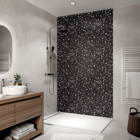 Apportez intensité et élégance à votre salle de bain avec le panneau mural Terrazzo Oscuro, un revêtement moderne aux éclats minéraux sur fond noir profond.