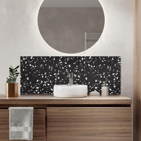 Apportez intensité et élégance à votre salle de bain avec le panneau mural Terrazzo Oscuro, un revêtement moderne aux éclats minéraux sur fond noir profond.
